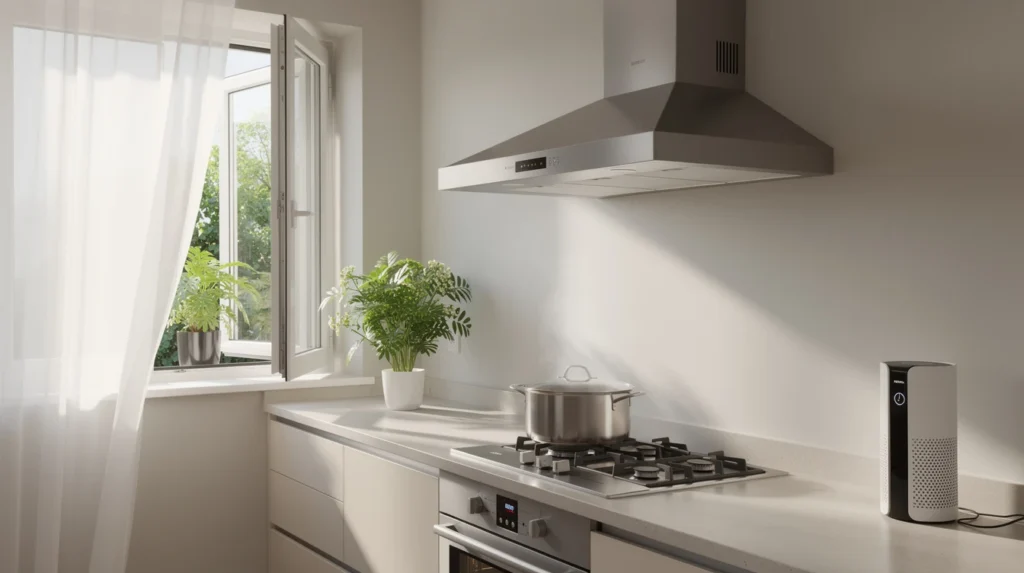 Pour limiter la propagation, couvrez vos casseroles et poêles dès que possible. Aérez systématiquement la pièce, même en hiver, dès le début de la cuisson. Si vous cuisinez des aliments particulièrement odorants, activez la hotte ou le purificateur d’air dès le début pour capter les particules dès leur émission.