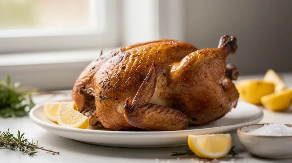 La préparation commence par le préchauffage du four à 200°C, ce qui assure une cuisson homogène dès le départ. Pensez à sortir le poulet du réfrigérateur 30 minutes avant la cuisson pour éviter un choc thermique. Par ailleurs, garnir l’intérieur de la volaille avec des aromates, un demi-citron et quelques gousses d’ail rehausse nettement la saveur. N’hésitez pas à masser la peau avec de l’huile ou du beurre et à saler généreusement, notamment sur toutes les faces.