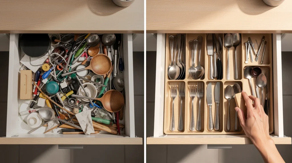 La cuisine est souvent le lieu où l’encombrement s’accumule le plus rapidement. Afin de trouver facilement ustensiles et couverts, il est conseillé d’utiliser des séparateurs ou des boîtes empilables. Ainsi, chaque catégorie d’objet possède sa place : fourchettes, couteaux, cuillères, gadgets. De surcroît, les plateaux tournants (lazy susan) permettent une accessibilité maximale dans les tiroirs profonds ou les coins difficiles à exploiter.