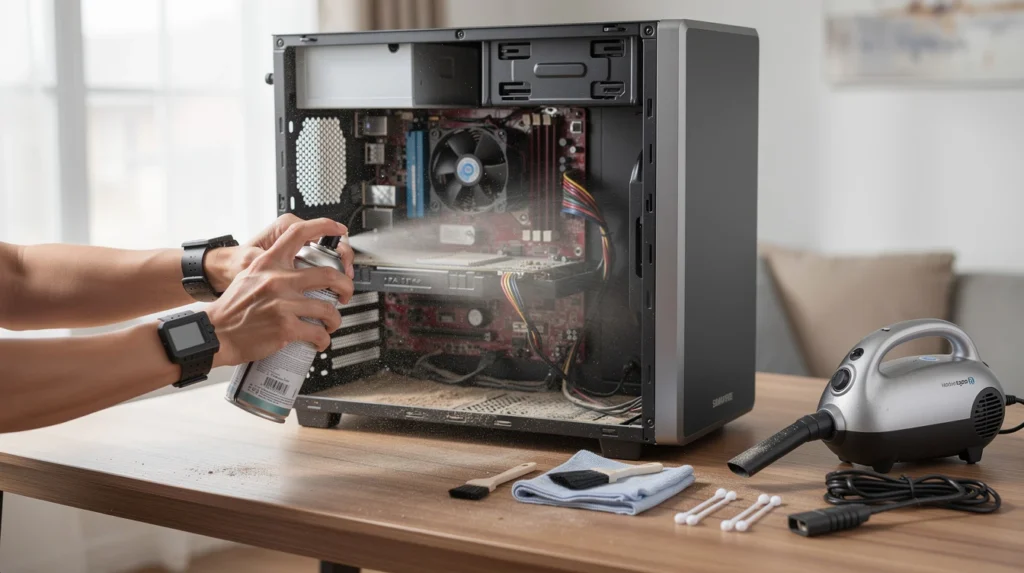 Pour nettoyer interieur ordinateur convenablement, munissez-vous des outils adaptés : une bombe d’air comprimé, un pinceau à poils doux, des chiffons en microfibre, des cotons-tiges et éventuellement un aspirateur à faible puissance. N’utilisez jamais de produits abrasifs ou d’eau directement sur les composants.